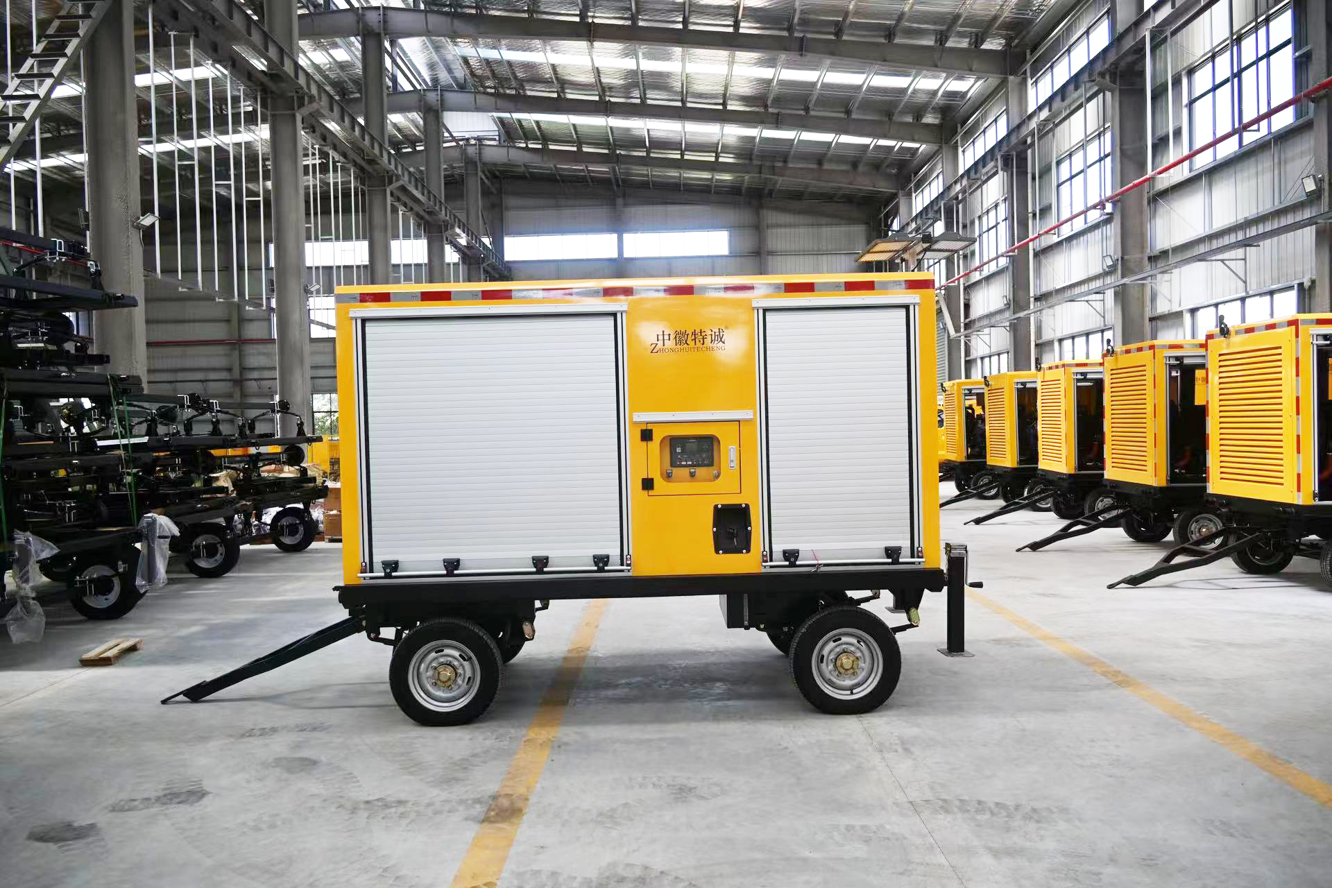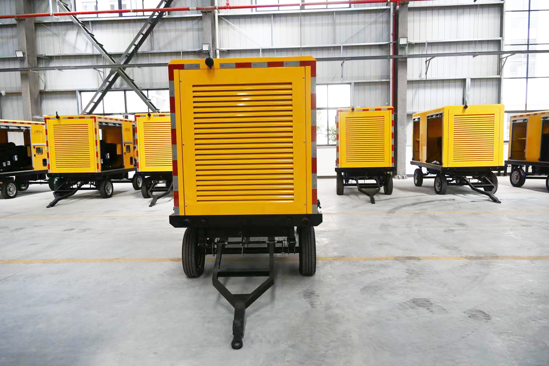 All adopt a steel structure frame trailer chassis, equipped with torsion bridge shock absorption, driving mechanical inertia braking and parking braking systems. The driving speed is 30 km/h, the turning speed is 10 km/h, and it can adapt to three-level roads and low-speed off-road conditions. The chassis contains 4 adjustable support legs (with mechanical swing arms), which can be flexibly disassembled to ensure operational stability. The entire vehicle adopts an integrated rainproof and silent body (≥1.5mm cold-rolled steel plate, electrostatically sprayed anti-rust), with internal filling of sound insulation cotton. The noise at 7 meters is ≤80 dB, and it has the ability to work outdoors in all weather conditions."