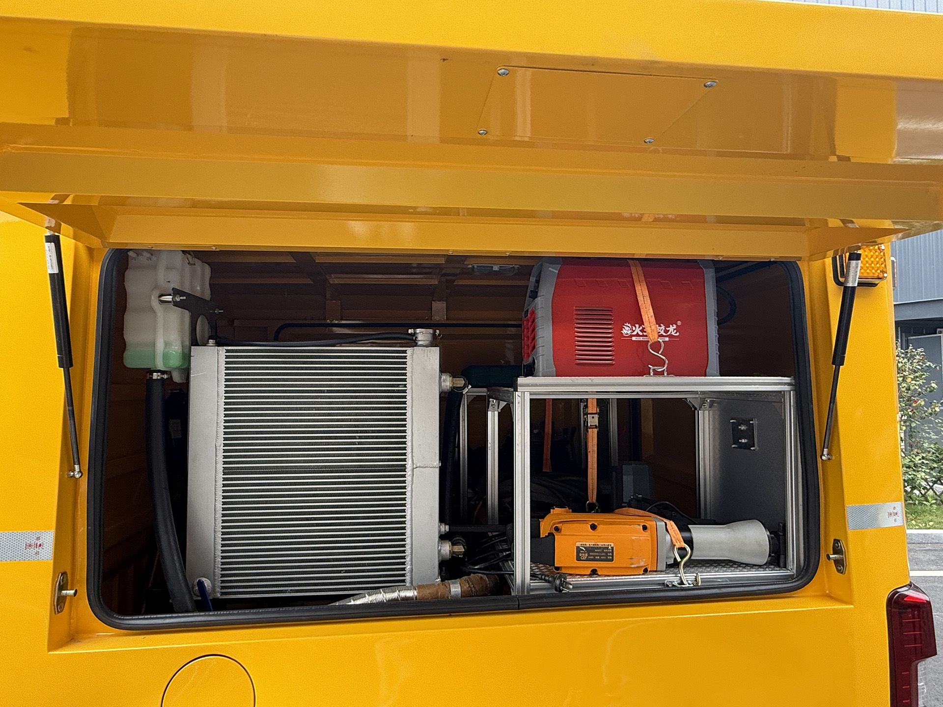 The enclosure adopts an integrated fully enclosed structure. The outer skin is made of rust-proof cold-rolled steel, featuring rainproof, fireproof and soundproof functions. The interior integrates control systems, water pumps and accessories, with a compact and practical layout. It is equipped with a 1.2-meter lifting lighting fixture (300W LED, 360° rotation, remote control) and a long row of warning lights (with flashing, alarm and speech functions), meeting the needs of night operations. The vehicle body is painted in Y07 engineering yellow warning color and is marked with reflective signs to enhance the identification during operations."